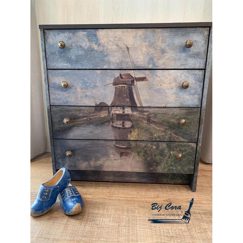All the themes and the quality of the paper itself have been chosen very carefully keeping in mind the artistic part of the creators. The goal is to be able to create furniture that is as authentic as possible and the decorations with MINT decoupage paper look like real paintings on your furniture and thus make it a work of art. So depending on the method you use, you can have completely different results – direct application of the paper will result in your paper being slightly wrinkled (but flat) which helps as an effect to make your piece look authentic ( as if you had painted it). While ironing it will lead to a completely flat and ‘clean’ effect on your furniture.