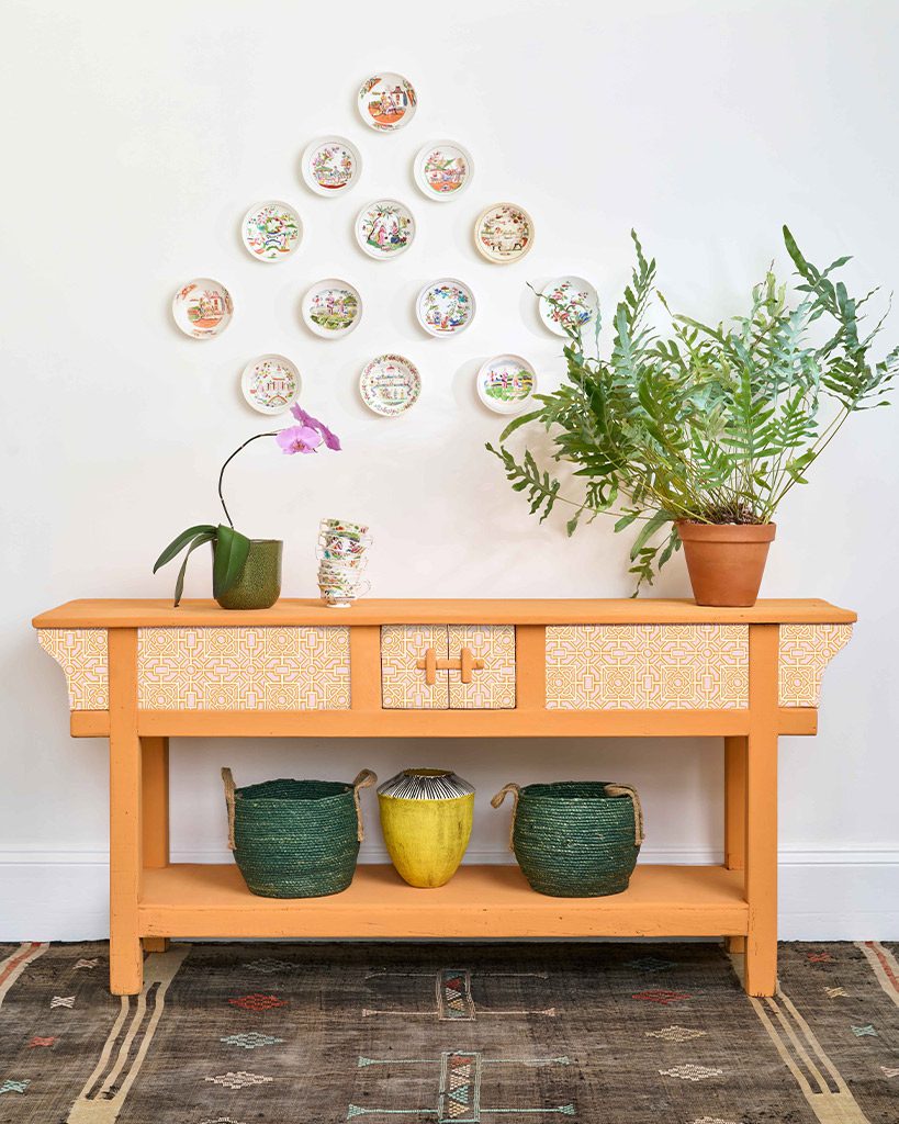 Τα χαρτιά decoupage Borders απεικονίζει  ένα σχέδιο με κόμπους  που βρίσκουμε  στους  κήπους “The Orchard and the garden” στο  Λονδίνο: τυπώθηκε από τον Adam Islip το 1602. Αυτό το γεωμετρικό σχέδιο είναι μια περίτεχνη επανάληψη τετραγώνων και κύκλων, τυπωμένα ώστε να ταιριάζουν με τα χρώματα Chalk Paint® Barcelona Orange και Antοιnette.
