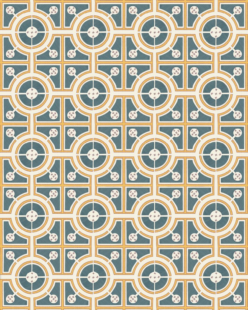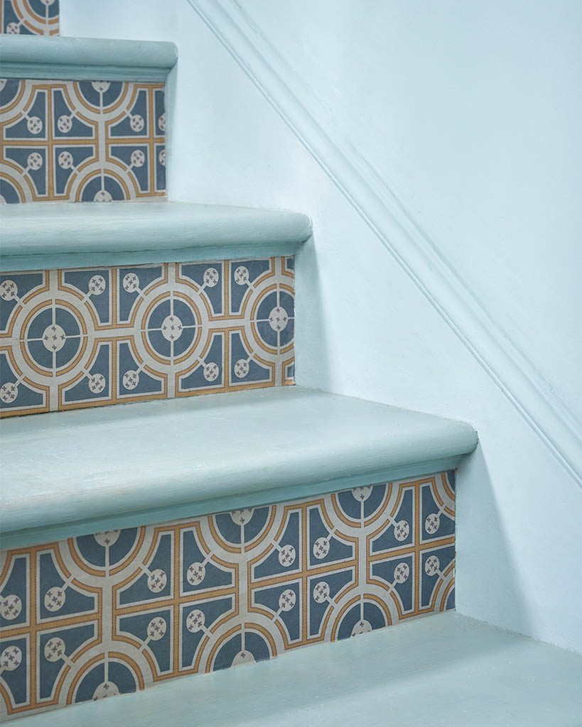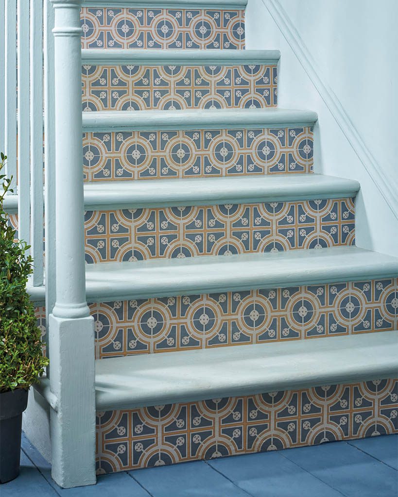 Το Roundabouts είναι ένα απόσπασμα  από μια χαραγμένη απεικόνιση σχεδίου για έναν κήπο με κόμπους. Αυτό το χαρτί Decoupage της Annie Sloan με τη Royal Horticultural Society (RHS) χρησιμοποιεί ένα σχέδιο κήπου από τον Stephen Blake: «The Compleat Gardeners Practice». Λονδίνο: 1664. Τυπώθηκε για τον Thomas Pierrepoint. Αυτό το τολμηρό κυκλικό και τετράγωνο σχέδιο απεικονίστηκε με  χρώμα κιμωλίας  Aubusson Blue (διαθέσιμο σε Chalk Paint® και Annie Sloan Wall Paint) και χρώμα κιμωλίας  Tilton  Chalk Paint® ένα χρώμα που θυμίζει πορτογαλικά πλακάκια.