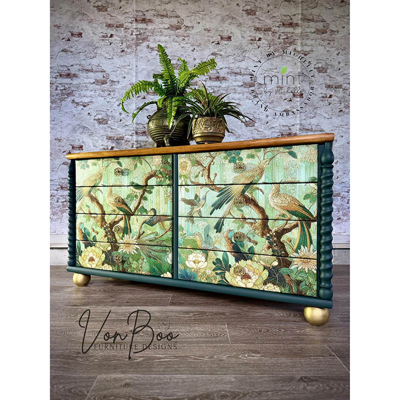 Το ιδανικό μέγεθος χαρτιού και εκτύπωση έχουν φροντιστεί επιμελώς από τη Michelle, ιδιοκτήτρια της MINT, και είναι το αποκορύφωμα χρόνων δουλειάς με χαρτιά decoupage και μεταμορφώσεων επίπλων με σκοπό την μοναδικότητα, το στυλ και την καλλιτεχνική αρτιότητα.