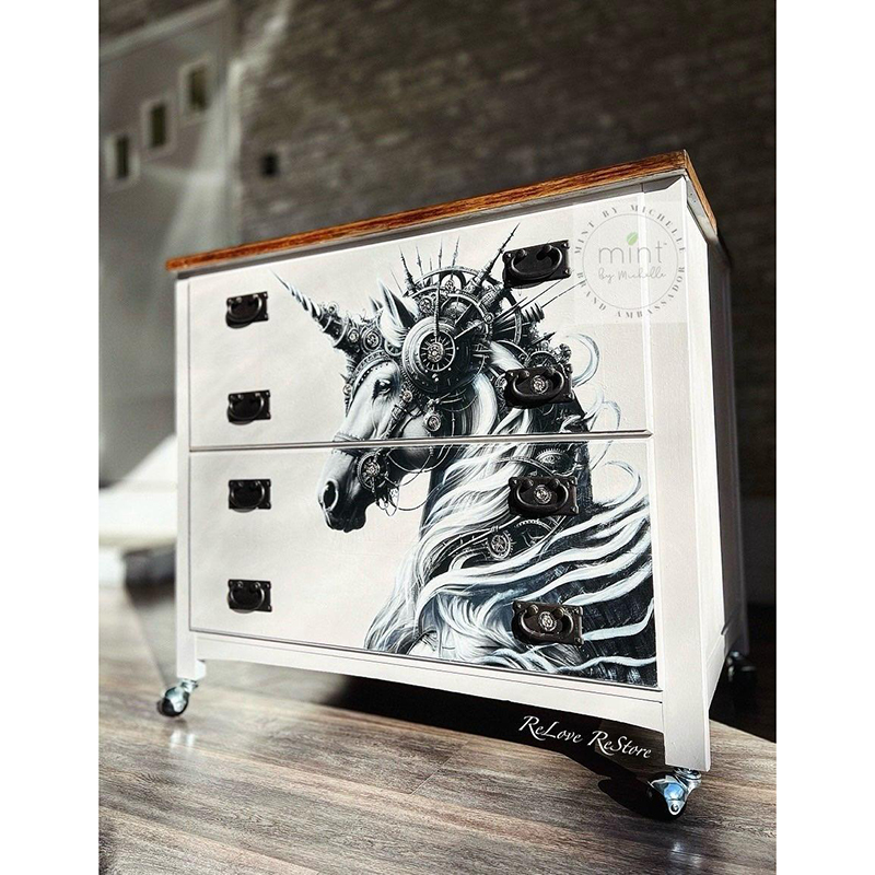 Το ιδανικό μέγεθος χαρτιού και εκτύπωση έχουν φροντιστεί επιμελώς από τη Michelle, ιδιοκτήτρια της MINT, και είναι το αποκορύφωμα χρόνων δουλειάς με χαρτιά decoupage και μεταμορφώσεων επίπλων με σκοπό την μοναδικότητα, το στυλ και την καλλιτεχνική αρτιότητα.